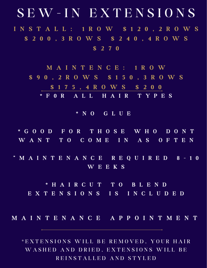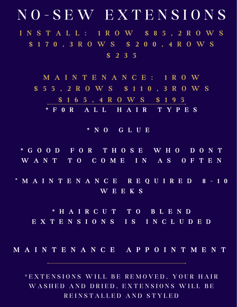 I offer three killer hair extension techniques:tape-ins, no-sew beaded weft, and sew-ins. Not sure which one’s for you? No, worries! We’ll go over each option and find the perfect match for your hair and budget. Already rocking extensions but thinking about switching it up? Let’s chat-we can totally try something new!